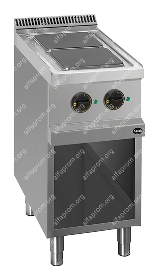 Электрическая плита Apach APRE-47P 700-й серии предназначена для приготовления различных блюд из мяса, птицы, рыбы и овощей в наплитной посуде на предприятиях общественного питания и торговли. Модель оснащена электромеханической панелью управления, быстро нагревающимися конфорками, гидроизолированной прессованной поверхностью и открытой подставкой с регулируемыми по высоте ножками. Корпус, рабочая поверхность, панель управления и вытяжная решетка выполнены из нержавеющей стали AISI 304, боковые и задняя панели - из нержавеющей стали AISI 430.